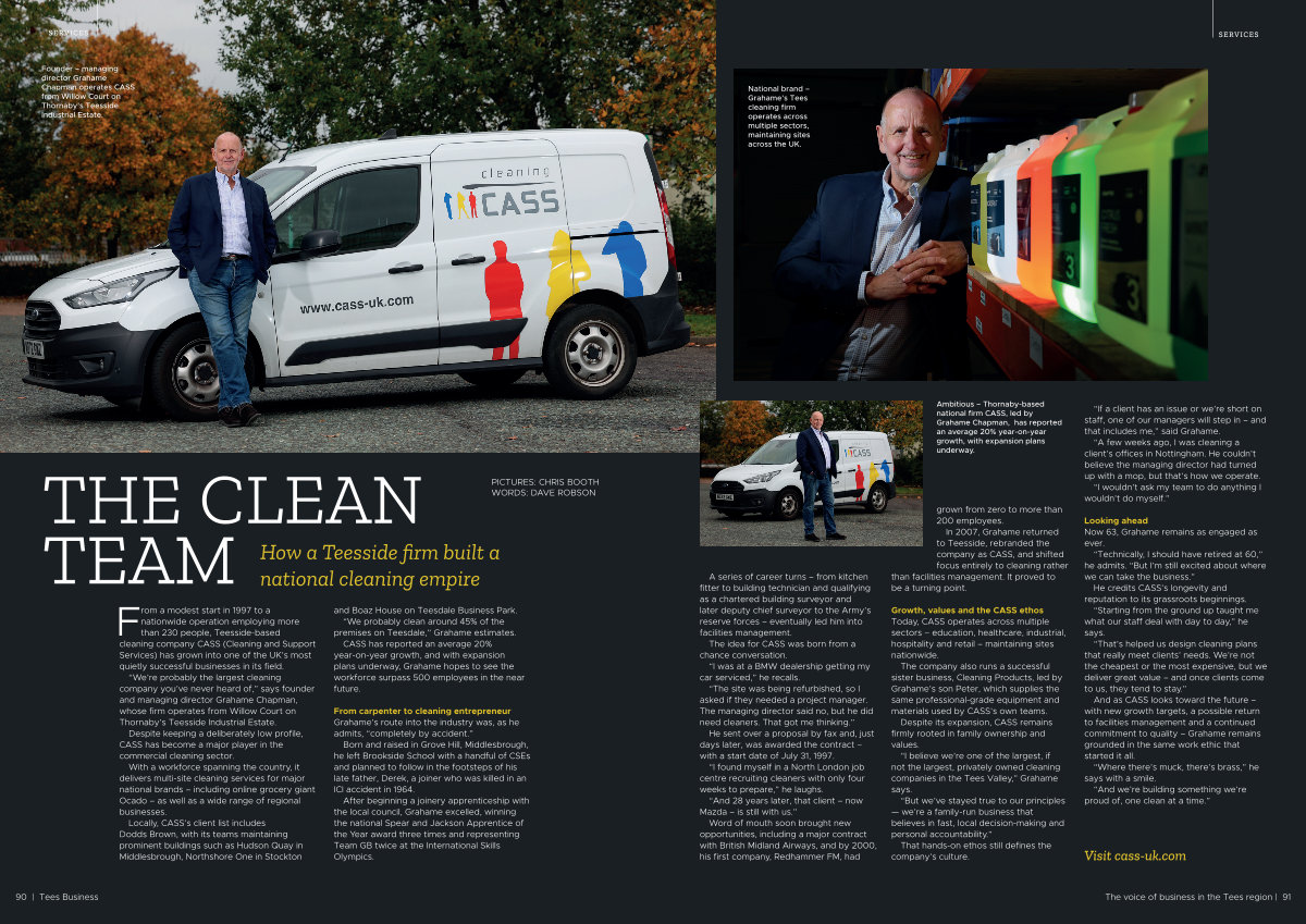 From a modest start in 1997 to a nationwide operation employing more than 230 people, Teesside-based cleaning company CASS( Cleaning and Support Services) has grown into one of the UK’ s most quietly successful businesses in its field.