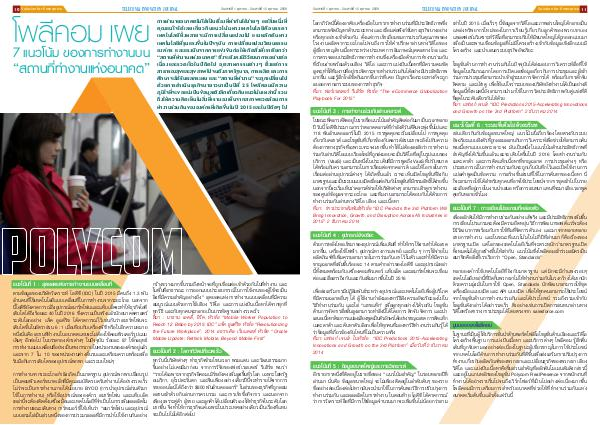 ในฐานะที่เป็นผู ้ให้บริการชั้นน�ำด้านพอร์ตโฟลิโอโซลูชั่นด้านเสียงและวิดีโอ โครงสร้างพื้นฐาน การแบ่งปันเนื้อหา และบริการต่างๆ โพลีคอม รู้สึกตื่น เต้นที่ถูกจับตามองอย่างต่อเนื่องในฐานะผู้เชี่ยวชาญในการใช้ประโยชน์ จากเทคโนโลยีด้านการท�ำงานร่วมกันที่ดีขึ้นเพื่อส่งเสริมการปรับปรุงการ ท�ำงานเกี่ยวกับผลิตภัณฑ์ของพวกเขาและเปลี่ยนธุรกิจของพวกเขา เสียง วิดีโอ และแบ่งปันเนื้อหาคือชิ้นส่วนส�ำคัญที่ผลักดันโมเมนตัมดังกล่าวนี้ และอยู่ในแกนหลักของโซลูชั่น Polycom RealPresence จากพนักงานที่ ท�ำงานได้อย่างราบรื่นไปจนถึงเวิร์กโฟลว์ที่เป็นไปอย่างต่อเนื่องมากขึ้น โพลีคอมมีการเตรียมการส�ำหรับอนาคตที่ช่วยให้ที่ท�ำงานร่วมกันแห่ง อนาคตเริ่มต้นขึ้นแล้วตั้งแต่วันนี้