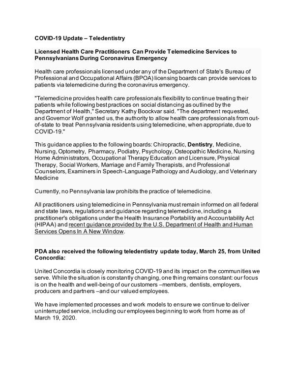 PDA also received the following teledentistry update today , March 25 , from United Concordia :