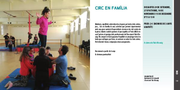 Malabars, equilibris sobre objectes, trapezi, pal xinès, teles aèries, jocs... Circ en Família és una activitat que permet experimentar amb una gran varietat d’ especialitats circenses des del centre de la pista. Infants i adults aprenen el que significa el“ més difícil encara” gràcies al guiatge dels professionals de l’ Associació Tub d’ Assaig. No sempre és fàcil aguantar l’ equilibri ni arreplegar totes les boles que voltegen per l’ aire, ni sostenir-se sobre les teles aèries. Però diversió i bona companyia estan assegurades.