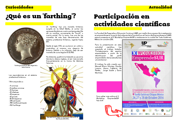 La Facultad de Posgrados y Educación Continua UJMD, por medio de su equipo de investigación en emprendimiento (a partir de la alianza de la Facultad con el Centro de Emprendimiento UJMD) estará presente en el X Workshop EmprendeSUR a realizarse en la ciudad de Tuxla Gutiérrez, México en octubre 2016.