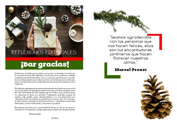 No obstante, este espacio tan personal es el sustrato donde nace una virtud única: la gratitud. En esta época existe, entonces, una alta propensión para ser más conscientes de todo aquello que nos rodea y que, muchas veces, no valoramos al darlo por sentado. Tristemente, grandes sucesos de nuestra vida pueden pasar desapercibidos si no nos esforzamos por valorarlos. Poner en práctica la gratitud es una tarea vital . Por tal razón, en este número, se exploran diversas prácticas y costumbres ancestrales dedicadas a valorar la Navidad y a expresar la gratitud.