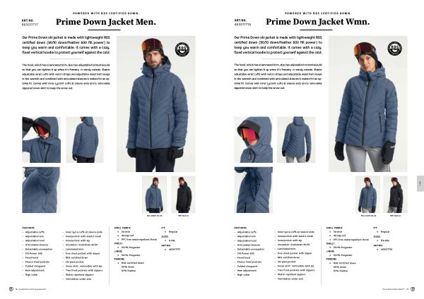 - Inner lycra cuffs at sleeve ends - Innerpocket with elastic mesh - Innerpocket with zip - Insulation : Duckdown 90 / 10 - Laminated brim - One chest pocket with zipper - RDS certified down - Ski pass pocket - Snow skirt : removable with zip - Two front pockets with zippers - Water repellent zippers - Ventilation under arm |
