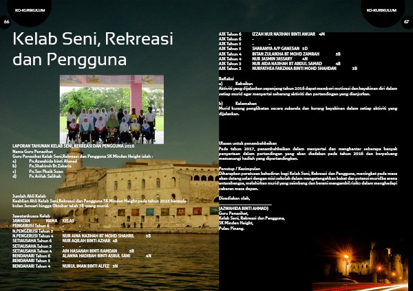 Diharapkan peratusan kehadiran bagi Kelab Seni, Rekreasi dan Pengguna, meningkat pada masa akan datang selari dengan misi sekolah dalam mengetengahkan bakat dan potensi murid ke arena antarabangsa, melahirkan murid yang seimbang dan berani mengambil risiko dalam menghadapi cabaran masa depan.