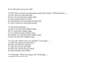 14 . Bill : “ Have you seen any interesting comedy lately , Nancy ?” Bill asked Nancy ___ . A ) if he will see an interesting film B ) if he saw an interesting comedy lately C ) what comedy Nancy saw lately D ) if she had seen any interesting comedy lately E ) if she would see an interesting comedy