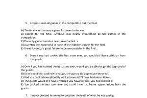 A ) The final was too easy a game for Juventus to win . B ) Except for the final , Juventus was nearly overcoming all the games in the competition . C ) The only game Juventus failed was the last . x D ) Juventus was successful in none of the matches except for the final . E ) It was Juventus ’ s great failure to be unsuccessful in the final .