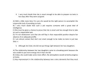 A ) With a little more time I ’ m sure she would be the right person to accomplish the responsible task of providing six tests . B ) I very much doubt that such a job requires someone with a great deal of intelligence . C ) She must be given a chance to prove that she is smart and has enough time to take on such a responsible task . D ) I ’ m not whatsoever sure that she will flop in that responsible position despite her absence of an adequate profile . E ) I am almost certain that she ’ s not smart enough to be make six tests in just two days . x