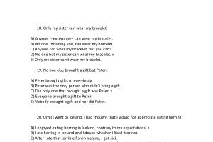 A ) Peter brought gifts to everybody . B ) Peter was the only person who didn ’ t bring a gift . C ) The only one that brought a gift was Peter . x D ) Everyone brought a gift to Peter . E ) Nobody brought a gift and nor did Peter .