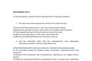 RESTATEMENT TEST 3 For these questions , choose the best rephrased form of the given sentence .