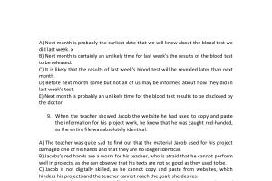 A ) The teacher was quite sad to find out that the material Jacob used for his project damaged one of his hands and that they are no longer identical . B ) Jacobs ’ s red hands are a worry for his teacher , who is afraid that he cannot perform well in projects , as she can observe that his texts are not so good as they used to be . C ) Jacob is not digitally skilled , as he cannot copy and paste from websites , which hinders his projects and the teacher cannot reach the goals she desires . D ) Jacob and his teacher had a difficult conversation about his project once he used information from a website that didn ’ t match the goals that were aimed at . E ) Jacob did not follow the rules as he plagiarised information from a webpage , and there was no way he could deny his wrongly act when he was confronted to the evidence . x