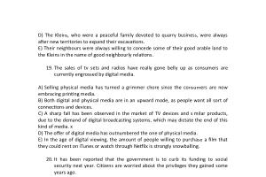A ) Selling physical media has turned a grimmer chore since the consumers are now embracing printing media . B ) Both digital and physical media are in an upward mode , as people want all sort of connections and devices . C ) A sharp fall has been observed in the market of TV devices and similar products , due to the demand of digital broadcasting systems , which may dictate the end of this kind of media . x D ) The offer of digital media has outnumbered the one of physical media . E ) In the age of digital viewing , the amount of people willing to purchase a film that they could rent on iTunes or watch through Netflix is strongly snowballing .