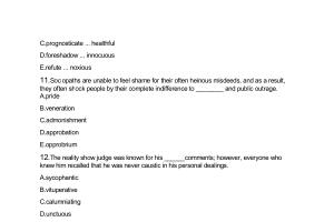 11 . Sociopaths are unable to feel shame for their often heinous misdeeds , and as a result , they often shock people by their complete indifference to ________ and public outrage . A . pride