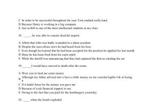 A Albeit that John was badly wounded in a chain accident B Despite the marvellous news he had heard from his boss C Even though he learned that he had been accepted for the position he applied for last month D Since he has been fired from his curre ntjob E While the sheriff was announcing that they had captured the thieves stealing his car