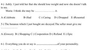 6- ) Everything you do or say is ………………….. of your personality . A- ) Make B- ) Reflective C- ) Sensible D- ) Memorize E- ) Clarity 7- ) She can be a tough lady to ………………… with . A- ) Ability B- ) Strength C- ) Dispose D- ) Negotiate E- ) Resign
