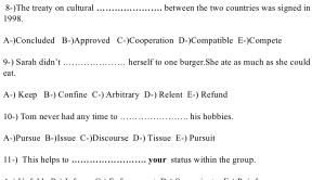 A- ) Keep B- ) Confine C- ) Arbitrary D- ) Relent E- ) Refund 10- ) Tom never had any time to ………………….. his hobbies . A- ) Pursue B- ) Issue C- ) Discourse D- ) Tissue E- ) Pursuit 11- ) This helps to ……………………. your status within the group . A- ) Unfold B- ) Inform C- ) Enforcement D- ) Sovereignty E- ) Reinforce 12- ) Lisa and I are very ………………… We ’ re both are interested in the same things . A- ) Simple B- ) Compatible C- ) Feasible D- ) Foible E- ) Impalpable