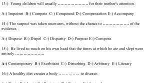 A- ) Contemporary B- ) Exorbitant C- ) Disturbing D- ) Arbitrary E- ) Literary 16- ) A healthy diet creates a body …………… to disease . A- ) Desist B- ) Assist C- ) Resistant D- ) Resign E- ) Instantly