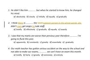 1 . He didn ’ t like him ............ but when he started to know him , he changed his mind . a ) absolutely b ) closely c ) initially d ) equally e ) gradually