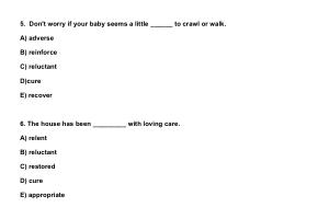 5 . Don ' t worry if your baby seems a little ______ to crawl or walk . A ) adverse B ) reinforce C ) reluctant D ) cure E ) recover