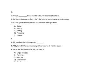 5 . A : Andy is __________ the show . She will surely be dressed perfectly . B : But it ' s not that easy to do it . I don ' t like being in front of cameras , on the stage . A : But she gets to meet celebrities and ask them tricky questions .