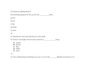 A : Everyone is talking about it ! B : Everything ' s going to be fine , just let the ___________ settle . a ) dust b ) rain c ) fog d ) drizzle e ) snow 16 A : I feel like the most miserable personi n the world . B : I know it ' s hard right now but every cloud has a ______________ lining .