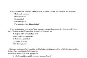 6 ) You saw your neighbour having a leg in plaster . You want to s how your sympathy . You would say : A That ’ s such nonsense ! B How disgusting ! C It was so bad ! D What a surprise ! E You poor thing ! How did you do that ?