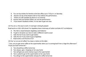 12 ) You are on the way to work . A road sign is being displayed : Road works on A26 . A26 closed . For Applebay leave motorway at Sutton and take A17 via Hollytree .