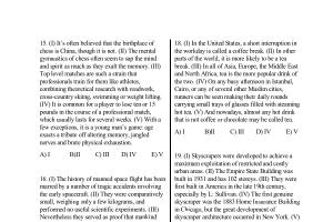 15 . ( I ) It ’ s often believed that the birthplace of chess is China , though it is not . ( II ) The mental gymnastics of chess often seem to sap the mind and spirit as much as they exalt the memory . ( Ill ) Top level matches are such a strain that professionals train for them like athletes , combining theoretical research with roadwork , cross-country skiing , swimming or weight lifting . ( IV ) It is common for a player to lose ten or 15 pounds in the course of a professional match , which usually lasts for several weeks . ( V ) With a few exceptions , it is a young man ’ s game : age exacts a tribute off altering memory , jangled nerves and brute physical exhaustion .