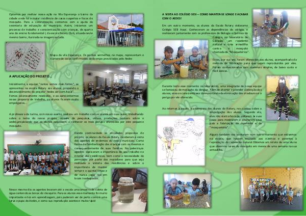 Em um outro momento, os alunos da Escola Rotary visitaramo Colégio SESI Assaí. Conheceram as dependências do colégio, e realizaram juntamente com os professores de Biologia e Química do Colégio, no laboratório de Ciências, um repelente natural e uma armadilha contra o mosquito chamada de“ Mosquetérica’’.