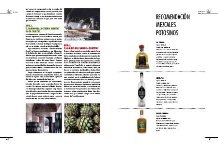 La ruta tes hornos de mampostería y oler las mieles del corazón de maguey recién cocido, marcará para siempre la forma en la que beberás un cuernito de mezcal: dos siglos de vivencias contenidos en un elixir más claro que el agua pero más fuerte que un trueno. RUTA 1. EL CAMINO REAL DE TIERRA ADENTRO HACIA CHARCAS. La ruta que sigue los pasos de los primeros exploradores españoles hacia el norte de México, nos llevará a una región de antiguas minas y santuarios erigidos para evangelizar a la población local. Esta también es la ruta de Miguel Hidalgo recorrió con su ejército cuando se dirigía a Saltillo. Aquí visitaremos el Centro Cultural “Roberto Donis” en Venado, emplazado en una fábrica textil de finales del siglo xix que utilizaba la fuerza hidráulica para generar energía. Este centro posee una importante colección de piezas aborígenes australianas, y obra del mismo Donis. Seguiremos hacia el sitio minero de Charcas, en donde tendremos oportunidad de degustar las famosas gorditas ferrocarrileras, mientras vemos las antiguas haciendas de beneficios. Luego entraremos en la región magueyera. Aquí se encuentran las importantes fábricas de mezcal de Laguna Seca y Santa Isabel, la primera del siglo xviii y la segunda del siglo xix. Ambas poseen estructuras en mampostería, bóvedas de medio punto y grandes hornos de cocción. Visitaremos también la fábrica de mezcal de Zaragoza de Solís, surgida en los primeros años del siglo xxi por iniciativa de una cooperativa rural. Aquí podremos ver cómo se aplica la tecnología de punta para producir mezcal y conocer nuevas visiones en torno a este destilado. 40 RUTA 2. EL CAMINO REAL SAN LUIS–ZACATECAS Esta ruta lleva hacia el occidente del estado, hasta el municipio de Salinas, donde se encuentra una de las instalaciones industriales más inusuales del Altiplano: las fábricas de sal. Esparcidas a lo largo de un gran lago salado de origen marino, estas fábricas abastecían a las haciendas de beneficio de plata y oro de Fresnillo. En el trayecto visitaremos las fábricas de mezcal de Santa Teresa e Ipiña, las dos en el municipio de Ahualulco. Ambas f