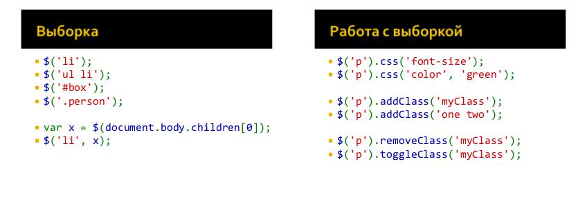 $('li'); $('ul li'); $('#box'); $('.person'); var x = $(document.body.children[0]); $('li', x);