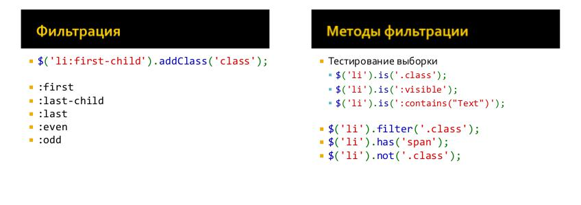 $('li:first-child').addClass('class'); :first :last-child :last :even :odd