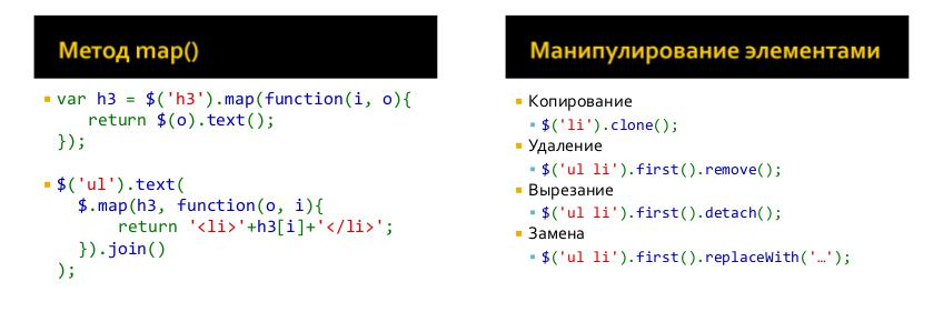 Копирование $('li').clone(); Удаление $('ul li').first().remove(); Вырезание $('ul li').first().detach(); Замена $('ul li').first().replaceWith('…');