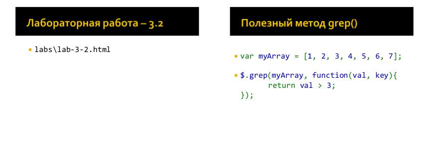 var myArray = [1, 2, 3, 4, 5, 6, 7]; $.grep(myArray, function(val, key){ return val > 3; });