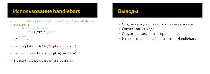 var template = $('#myTemplate').html(); var tmp = Handlebars.complie(template); $(document.body).append(tmp(title));