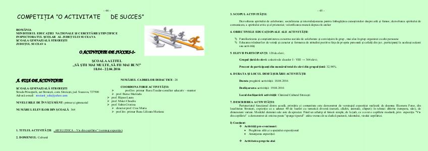 Parteneriatul funcțional dintre școală, primărie și comunitate este demonstrat de vernisajul expoziției realizată de doamna Eleonora Ferar, din localitatea Stroiești, expoziție ce a adunat 40 de lucrări cu tematică diversă( natură, clădiri, animale, chipuri) în tehnici diferite( tempera, ulei), de dimensiuni variate. Modelul domniei sale este de apreciat. Fiind un arhetip al femeii simple, de la țară, ce a avut o copilărie modestă, prin expoziția” Vis din copilărie” a demonstrat că oricine poate” sparge tiparul” atâta vreme cât se dedică pasiunii, talentului, visului copilăriei.