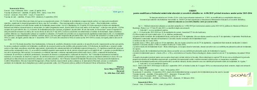 Art. I. - Ordinul ministrului educației și cercetării științifice nr. 4.496/2015 privind structura anului școlar 2015-2016, publicat în Monitorul Oficial al
