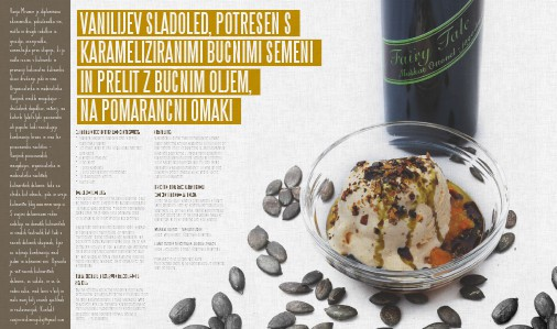 Vanja Mramor je diplomirana ekonomistka, pokuševalka vin, mošta in drugih izdelkov iz grozdja, ocenjevalka, sommeliejka prve stopnje, ki je našla izzive v kulinariki in promociji kakovostne kulinarike skozi druženje jedi in vina. Organizatorka in moderatorka Vanjinih vinskih mnogobojev – družabnih dogodkov, vecerij, na katerih ljubiteljski poznavalci ali popolni laiki raziskujejo kombinacije hrane in vina ter pivoznanske razlicice – Vanjinih pivoznanskih mnogobojev, organizatorka in moderatorka razlicnih kulinaricnih delavnic tako za otroke kot odrasle, piše in ureja kulinaricni blog www.mmm.vanja.si. S svojimi delavnicami redno sodeluje na domacih kulinaricnih VANILIJEV SLADOLED, POTRESEN KARAMELIZIRANIMI BUČNIMI SE IN PRELIT Z BUČNIM OLJEM, NA POMARANČNI OMAKI ZA PRIPRAVO TE IZVRSTNE SLADICE POTREBUJETE: SERVIRANJE: • vaniljev sladoled, najboljši tisti, s pravo burbonsko vaniljo • (če imate voljo in čas, si ga lahko naredite tudi sami) • 6 večjih pomaranč • 2 dcl vode • 1 žlica sladkorja • 1 žlica pomarančne marmelade • 10 dag bučnih semen • bučno olje V skodelico damo malo pomarančne omake, nanjo zvrnemo kepico sladoleda, ki pa naj bo že bolj mehek (in ne neposredno iz zamrzovalnika). Sladoled potresemo z zdrobljenimi ohlajenimi karameliziranimi bučnimi semeni in prelijemo s par kapljicami bučnega olja. Po želji lahko okrasimo s koščki pomaranče, ki smo jih prej posušili v pečici (znotraj so še vedno sočne, zunaj pa posušene). POMARANČNA OMAKA: Pomaranče operemo in na tanko olupimo. Olupke damo v lonec z vodo in jih kuhamo približno 15 minut. Vodo odlijemo. Postopek ponavljamo toliko časa, da je voda, ki jo odlivamo čista (cca šestkrat oz. bolje večkrat kot premalo). jedmi in izbranimi vini. Opravila Olupljenim pomarančam dodamo vodo, sladkor in pomarančno marmelado (če nimamo marmelade, damo nekoliko več sladkorja). Na počasnem ognju kuhamo toliko časa, da se sok zreducira (cca uro in pol). V kuhan sok vmešamo na drobno narezane kuhane pomarančne olupke, vse skupaj še nekaj časa kuhamo, nato pa dobro ohladimo. Najbolje, da je omaka čez noč v hladilniku. delavnic, se sukala, in se še KARAMELIZIRANA, MLETA, SUHO PRAŽENA BUČNA SEMENA: in vinskih festivalih kot tudi v raznih delovnih skupinah, kjer se izbirajo kombinacije med je vec raznih kulinaricnih vedno suka, med lonci v bolj in malo manj bolj znanih gostilnah in restavracijah. Kontakt: vanjinvinskimnogoboj@gmail.com Bučna semena stresemo na ponev in jih suho prepražimo. Ohlajena zmeljemo v možnarju in jih na hitro karameliziramo z malo sladkorja. Med praženjem ves čas mešamo. Karamelizirana semena na tanko razporedimo na s peki papirjem obloženo ravno površino (deska, pekač, p ladenj ...) in ohladimo. IN ŠE VINO, KI GA BREZ KAKRŠNIHKOLI ZADRŽKOV PRIPOROČAM POLEG: Glede na to, da je sladica pripravljena s Štajerskim pridihom, sem se seveda osredotočila na štajerska, oz. prleška vina. Tokrat vam predlagam dve izmed njih, bi pa prav gotovo našla še kakšnega, ki bi se odlično ujel s to sladico: Muškat Otonel – jagodni izbor, 2009, Vino Kolarič, Štajerska Slovenija Laški rizling Holermuos, pozna trgatev, 2006, Jeruzalem Ormož, Štajerska Slovenija Poskusite in se prepričajte sami. Po besedah tistih, ki so kombinacijo že preverili, vam ne bo žal ...
