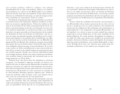 derecha, o que una víctima de torturas fuera sobrina de un torturador. Hasta las hinchadas futbolísticas se inscriben en un estilo provinciano. Que un hincha de Peñarol se enamore de una chica de Nacional, o viceversa, puede originar resentimientos familiares de tal envergadura, que los conviertan en los Montescos y Capuletos del subdesarrollo.? ?Como todas las ciudades del mundo, provincianas o no, Montevideo tiene mala conciencia de su vivir y de su morir, y quizá por eso no suele enseñar a los turistas sus cinturones de indigencia. Sin embargo a los extranjeros, y especialmente a los españoles, les gusta Montevideo. A mí también. Lo cierto es que en esta ciudad hay menos urgencias y menos stress que en las otras capitales de la franja atlántica. Su costa sureña, abundante en playas, y su estilo de vida, que asume sin conflicto la cercanía del prójimo, la hacen todavía, a pesar del legado de mezquindad que dejó la dictadura, una ciudad disfrutable y luminosa. Huelga decir que, por razones que quizá sean demasiado subjetivas, no la cambio por ninguna otra.?
