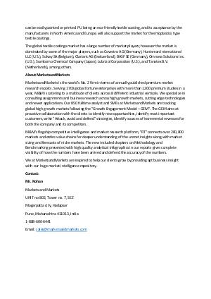 can be easily painted or printed. PU being an eco-friendly textile coating, and its acceptance by the manufacturers in North America and Europe, will also support the market for thermoplastics type textile coatings.