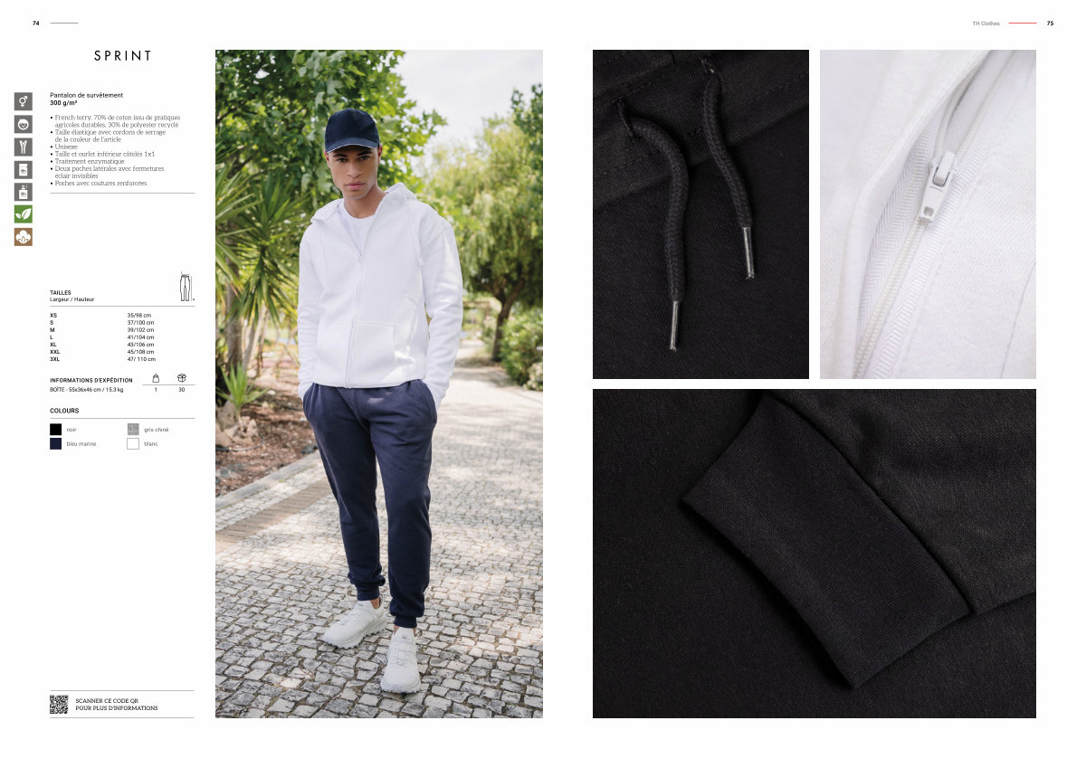 • French terry, 70 % de coton issu de pratiques agricoles durables, 30 % de polyester recyclé