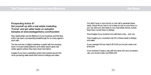 Prospecting Action # 7 Set yourself up with a real estate marketing ‘ Funnel ’ and get seller leads on autopilot . Samples at www . bestagentsinc . com / founders