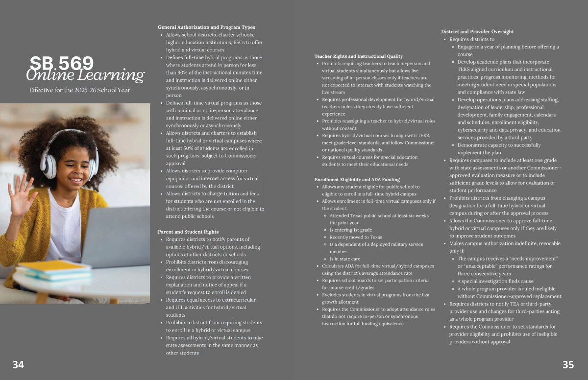 • Allows enrollment in full-time virtual campuses only if the student: o Attended Texas public school at least six weeks the prior year o Is entering 1st grade o Recently moved to Texas o Is a dependent of a deployed military service member o Is in state care