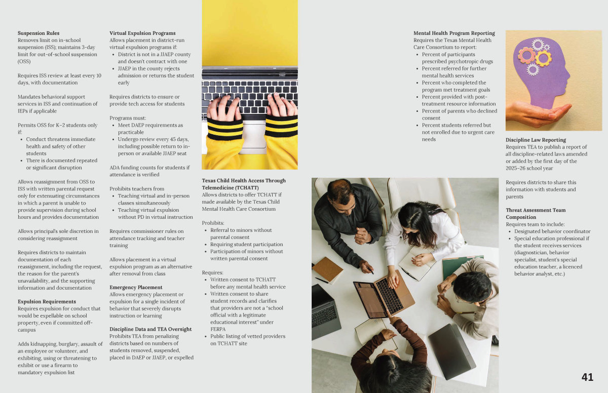 Discipline Law Reporting Requires TEA to publish a report of all discipline-related laws amended or added by the first day of the 2025-26 school year