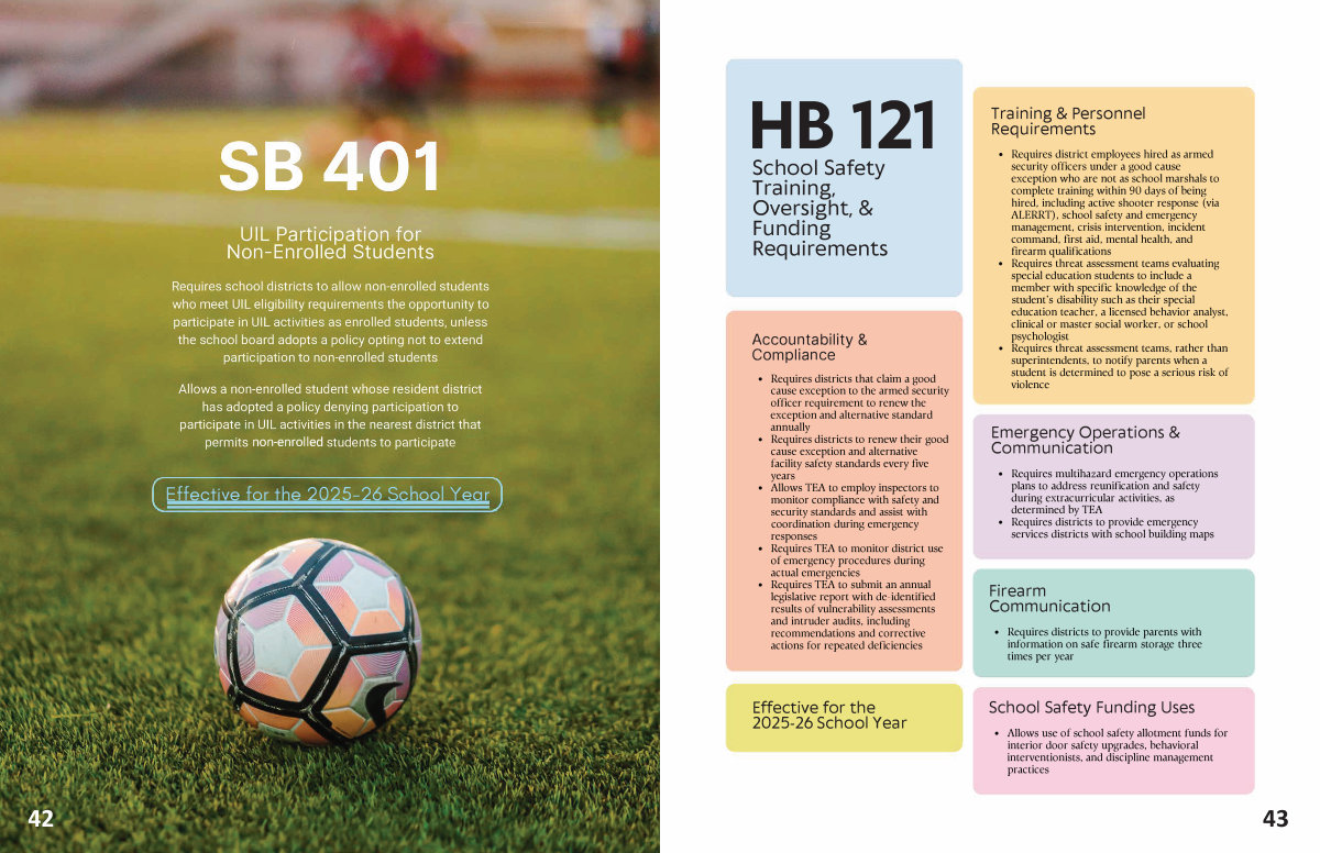 • Requires multihazard emergency operations plans to address reunification and safety during extracurricular activities, as determined by TEA