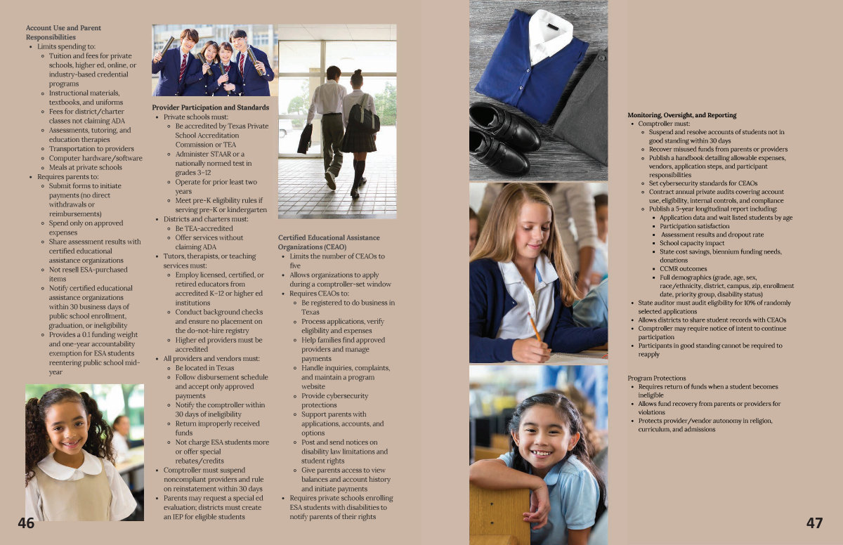 • Comptroller must: o Suspend and resolve accounts of students not in good standing within 30 days o Recover misused funds from parents or providers o Publish a handbook detailing allowable expenses, vendors, application steps, and participant responsibilities o Set cybersecurity standards for CEAOs o Contract annual private audits covering account use, eligibility, internal controls, and compliance o Publish a 5-year longitudinal report including: