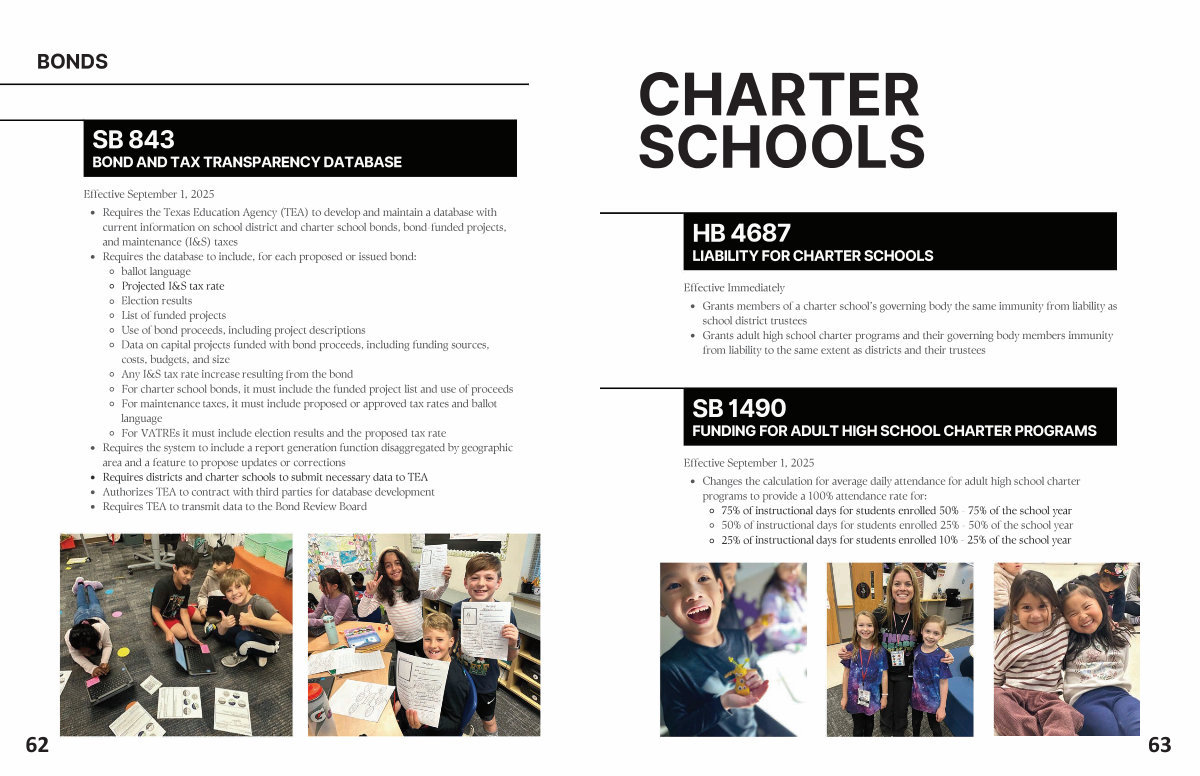 • Requires the Texas Education Agency( TEA) to develop and maintain a database with current information on school district and charter school bonds, bond-funded projects, and maintenance( I & S) taxes