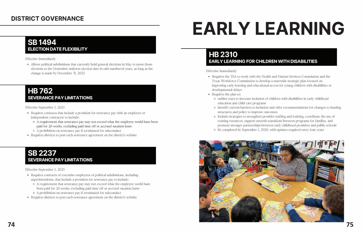 • Requires the TEA to work with the Health and Human Services Commission and the Texas Workforce Commission to develop a statewide strategic plan focused on improving early learning and educational access for young children with disabilities or developmental delays