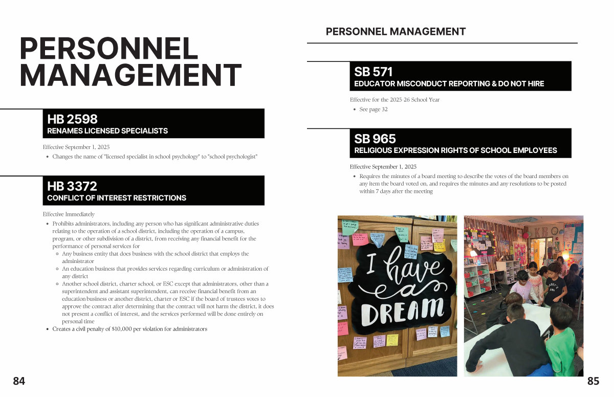 • Prohibits administrators, including any person who has significant administrative duties relating to the operation of a school district, including the operation of a campus, program, or other subdivision of a district, from receiving any financial benefit for the performance of personal services for o Any business entity that does business with the school district that employs the administrator o An education business that provides services regarding curriculum or administration of any district o Another school district, charter school, or ESC except that administrators, other than a superintendent and assistant superintendent, can receive financial benefit from an education business or another district, charter or ESC if the board of trustees votes to approve the contract after determining that the contract will not harm the district, it does not present a conflict of interest, and the services performed will be done entirely on personal time