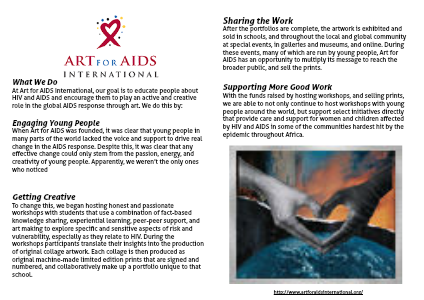 At Art for AIDS International, our goal is to educate people about HIV and AIDS and encourage them to play an active and creative role in the global AIDS response through art. We do this by: