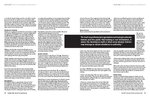 Normalization Normalization refers to a group dynamic that sets“ norms” for social groups. Norms are what is normal for the group. Normalization is what the abuser uses to control the environment by setting a group norm of abuse. Abusive individuals often are skilled at normalizing abuse. Statements such as,“ the dog is choosing the correction” or blaming the dog or client for needing to escalate positive punishment are two strategies victims described to normalize the abusive training of which they were being asked to comply. In one case a client was told“ this procedure is going to be very hard to watch, it is going to look like an exorcism.” The statement worked, the client remained passive while her dog was choked to death and died. This client was so traumatized by her“ participation” in the“ exorcism” that she remained passive and did not attempt to get justice for her dog.